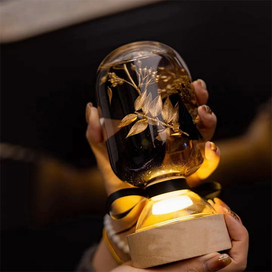 以玻璃為畫布,金箔為筆觸,礦物油與永生花的靈動碰撞,將深海秘境與星河幻影凝于方寸之間。