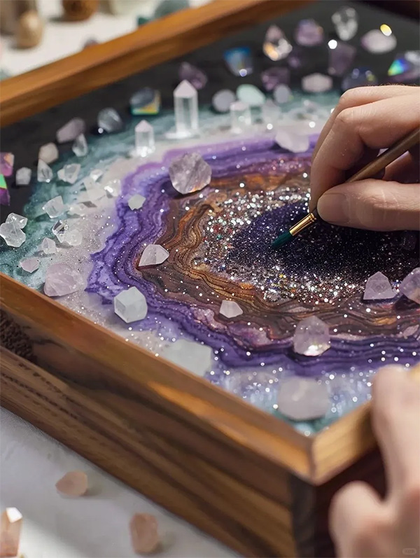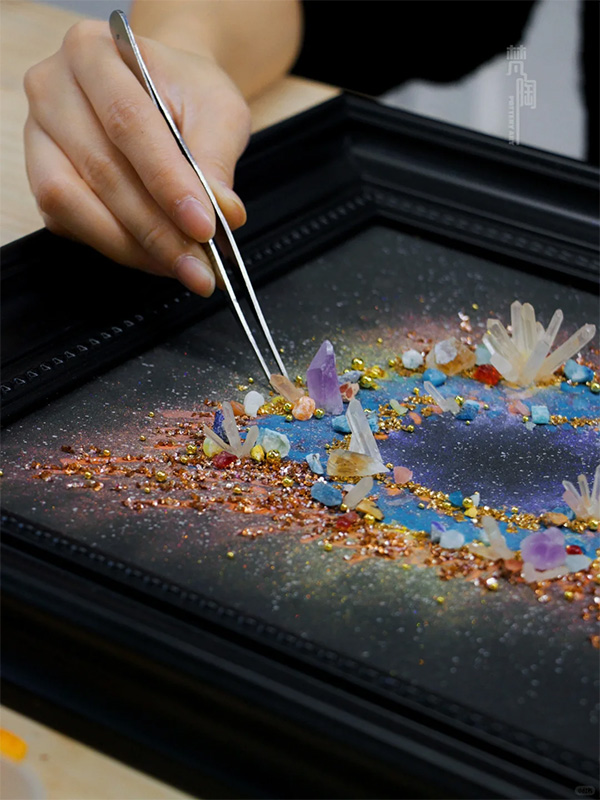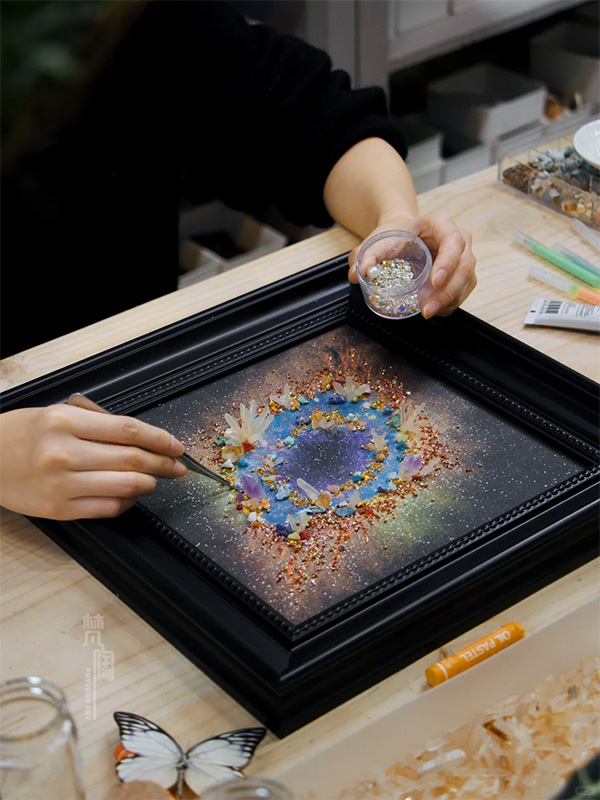 以天然水晶石為顏料,以匠心為靈感,在畫布上拼貼出獨一無二的光影畫卷。